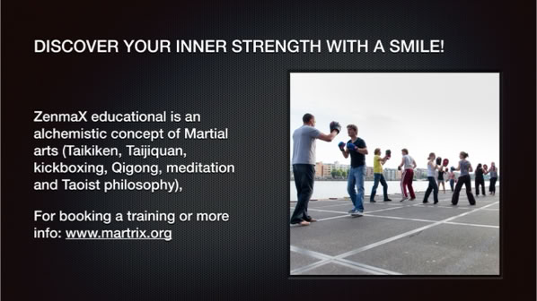 ZenmaX is an alchemistic fusion of Martial Arts (Taikiken, Taijiquan, Qigong and meditation) and Taoist philosophy. NLP, Mindfulness, Flow, Oneness, Reiki, Lineups, you name it, its time-honored ingredients from the Martial Arts. ZenmaX can be seen as the unification of the best ancient Martial Arts, Taoist philosophy and practical self-development.