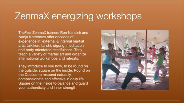 Book a ZenmaX energizing martial art - qigong intermezzo, or group balancing session for your yoga retreat, or any other workshop or seminar. We offer complete workshops from 1,5 hour to a whole morning, afternoon or evening program at the location of your wish. Our energizing intermezzos and workshops are also available a family tuning event at your private location or as a management training at your company.