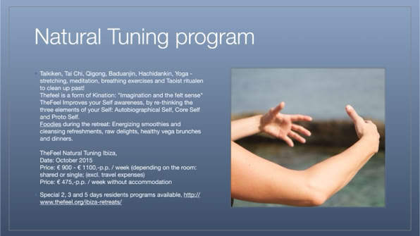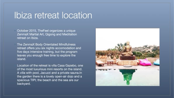 TheFeel offers martial arts, qigong, and meditation retreats on Ibiza in October 2015. The retreat will be held at a luxury villa with a pool, jacuzzi, and sauna, and include five days of training in taikiken, tai chi, qigong, yoga, and meditation. Participants can explore the beautiful beaches and sights of Ibiza during their free time. The retreat aims to improve self-awareness and provide opportunities for personal and professional growth through its blend of ancient martial arts practices and therapeutic experiences. Space is limited so early booking is encouraged.