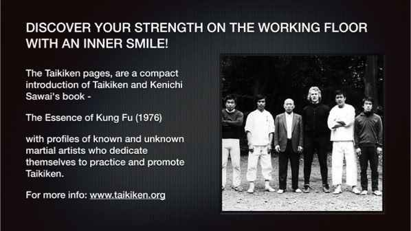 Ki in Tai Ki Ken briefly explained: The principle of Ki (Qi in Chinese), the intrinsic vitality, without which Taikiken would not be Tai Ki Ken, deserves some explanation. Although there are individual differences in the level of intrinsic vitality, Ki can be found in everyone. As a Taikiken practitioner, you try to develop your Ki to a level where your Ki manifests itself spontaneously at the moment you need it.